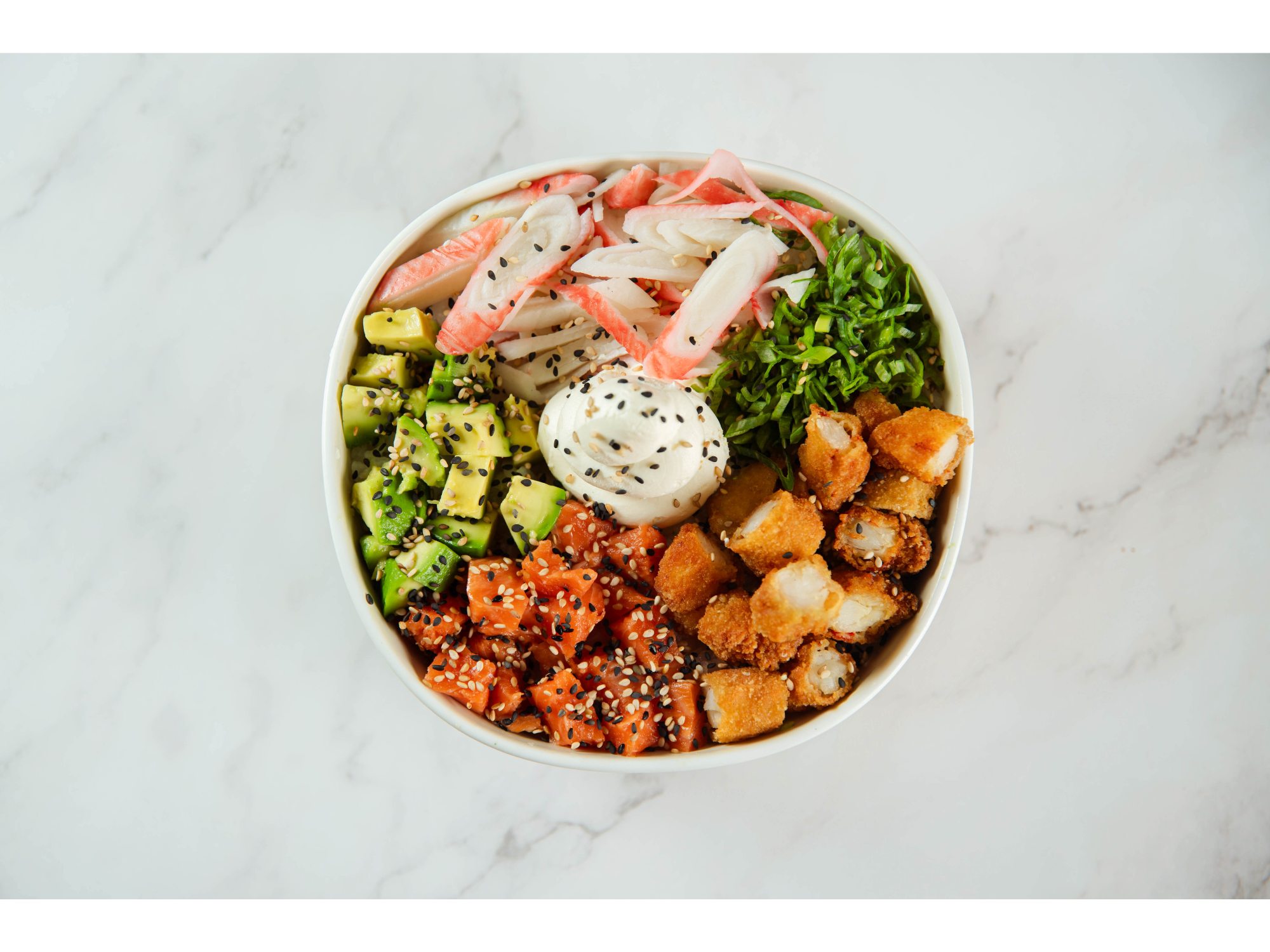 olchón de arroz, salmon trout, langostinos apanados, kanikama, queso philadelphia, palta, cebolla de verdeo y semillas de sésamo.